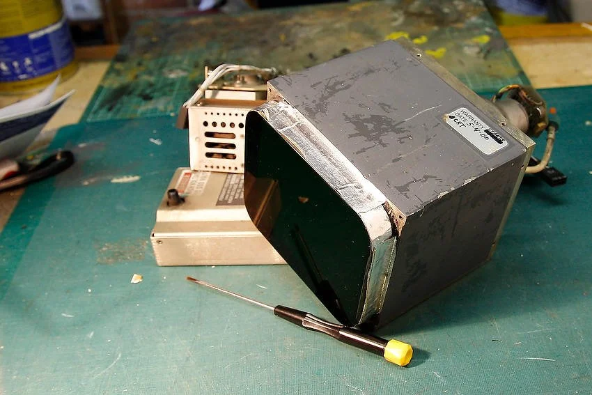 When the casing of the CDU is removed, the inside is jammed full of components, from the large CRT screen to gold-plated electronic boards that are clipped into one of three internal shelves.