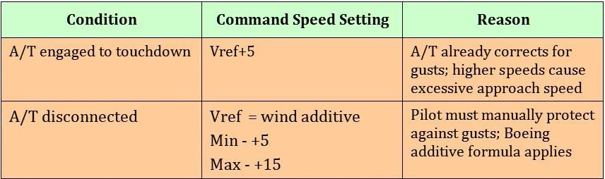 • If the autothrottle is to be engaged for landing (for example autoland), set the command speed to Vref+5. There is no need to add wind additives as the autothrottle logic already compensates for gusts through airspeed and acceleration sensing.