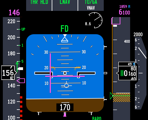 Located on the speed tape on the PFD is a white-coloured marker called a carrot (the carrot looks more like a sideways facing arrow). The position of the carrot indicates V2+15 or V2+20 KIAS (the + speed is determined by the engine type and can be set to +15 or +20 in the ProSim IOS).